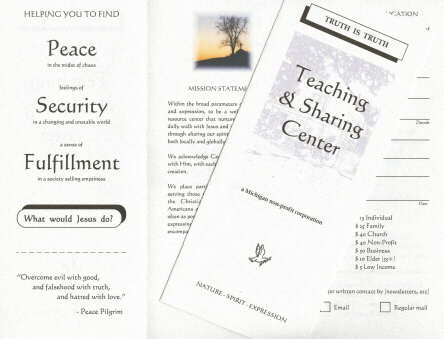 The Teaching & Sharing Center is now established as a Michigan non-profit corporation. We are in the process of completing the paperwork seeking a 501(c)(3) IRS designation (which will make your contributions tax deductible). When the IRS issues its ruling, deductibility becomes retroactive to the date of incorporation which was January 1, 2005. I encourage each of you to become a member of the new corporation even though it involves annual membership dues. $ 15 Individual I particularly anticipate seeing those of you as members who said not to close the Center, but to do everything possible to keep it going. Incorporation is not a magic bullet. This is a critical moment which will live or die on the response from those who think the Center has been a valuable community asset these past 10 years, and should continue to be so. Encouraging others to become supporting (and voting) members is something which will build a base to secure the future as well. The Board of Trustees currently consists of: Mike George Trustees hold the legal responsibility of decision making for the corporation. While, according to its by-laws, the T&SC can function with the current seven, there are open positions for up to six more trustees on the board. So, if you feel the Holy Spirit calling you to serve there is plenty of room. You would need to be able to attend board meetings (probably quarterly). It would be best if you have email for between meetings communications. But, if not, and you live close enough to regularly check your mailbox at the Center, a copy of emails could be printed for you. Many basic decisions will need to be made in the next few months by this initial board. I anticipate a likely three tier relational possibility with the Center. The first will remain "the poet’s circle" which will not be considered membership. It will simply be the corporate mailing list, and a basic requirement for library privileges. As the historical connection, being listed in the poet’s circle will remain free, but will carry no official status within the corporation. The next will be the basic paid membership. Members elect the board of trustees and vote on other matters pertinent to the Center at an annual meeting. Members will receive the traditional 10% discount at the Trade Center. Ultimately, I suspect there will be a special designation for those doing more than the basic membership. It would likely carry with it some extra benefits, and could very well be a requirement for the Keyholder program. Would you like to be a part of this decision making process? Let me know if you would like your name submitted to the board as a trustee candidate. Or, do you have another role you see yourself in here? Ask yourself: Who did God create you to be? Can that find expression in conjunction with or through the Teaching & Sharing Center?