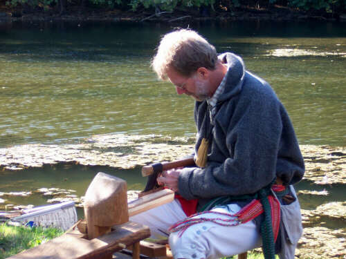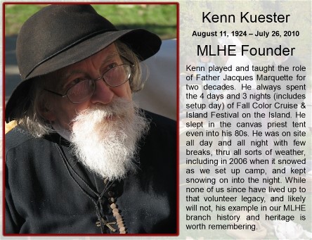 Michigan Living History Encounters (originally Encampment) is a branch of the Teaching & Sharing Centers non-profit organization. Our participation in the Fall Color Cruise & Island Festival continued until 2020. Designated the "Kenn Kuester Memorial Event," it expanded from just the voyageur-fur trade period to include 1800s, and 1900s, displays. Covid-19 pre-empted our participation in 2020, when the three day FCC&IF was replaced with a one day Grand Ledge Fall Festival. We rejoined the new one day festival in 2021, but logistically unable to set up for a single day on the island, we relocated our encampment and displays to Joyce Park (115 East Lincoln Street) directly behind the Teaching & Sharing Center of Grand Ledge (417 South Bridge Street). Although, as an active teaching & sharing center, it currently only exhibits during the festival, it is an exceptional learning experience for those who take the time to visit with our presenters. This program is in its infancy, and has great potential for expansion and involvement. Anyone curious about MLHE activities, or possibilities, should contact us. We also filed "American Living History Encounters" as a DBA for those who have family history, or simply an active interest, in aspects of our American history beyond Michigan borders that they feel could add to the teaching and sharing opportunities being offered by MLHE-ALHE. Kenn Kuester is seen below teaching in his role as Father Marquette. The "Kenn Kuester Memorial Event" during the Grand Ledge Fall Festival continues in memory of his annual presence, for almost twenty years, during the former three day festival. He spent both his days and nights functioning from, and sleeping in, his "priest" tent through all types of weather conditions. A benefit of his nightly presence at the voyageur encampment site was being able to join him around the campfire, during the quiet of non-festival hours. "It is important to understand your history, if you wish to be wise in determining your future." |